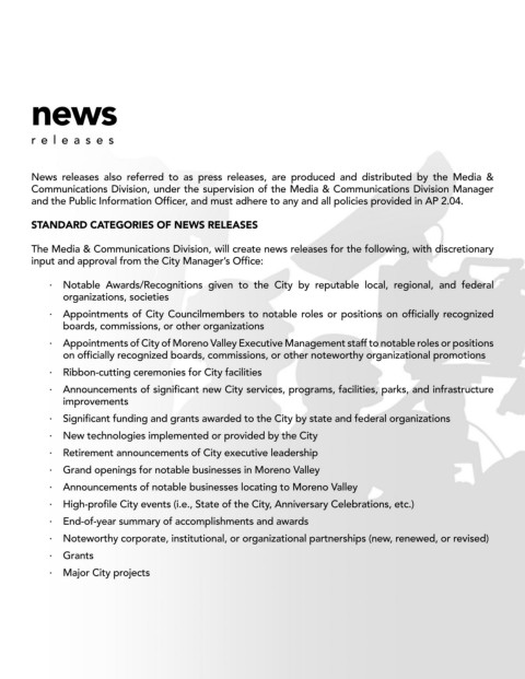 The Media & Communications Division, will create news releases for the following, with discretionary