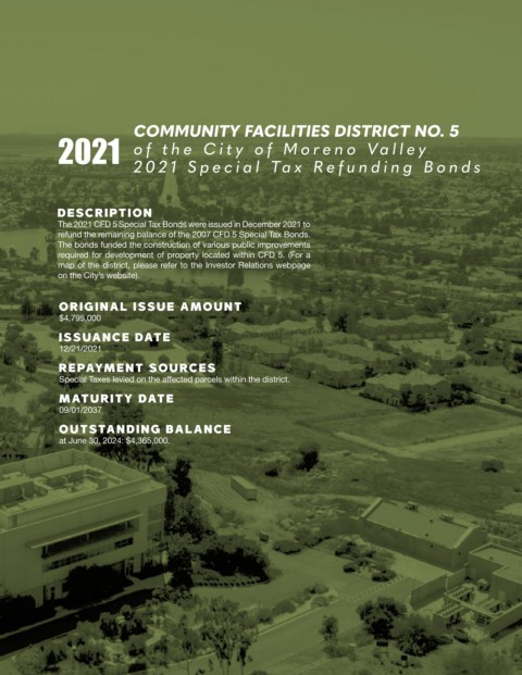 description The 2021 CFD 5 Special Tax Bonds were issued in December 2021 to