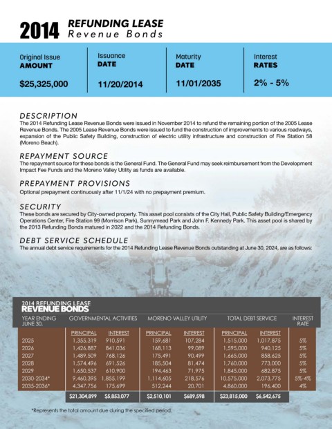 YEAR ENDING      GOVERNMENTAL ACTIVITIES      MORENO VALLEY UTILITY         TOTAL DEBT SERVICE      INTEREST                          YEAR ENDING                 PRINCIPAL            INTEREST          INTEREST RATE