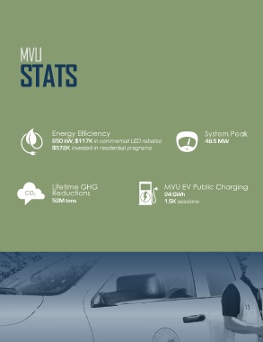 MVU STATS Energy Efficiency System Peak 650 kW, $117K in commercial LED rebates 48.5 MW $572K invested in residential programs Lifetime GHG MVU EV Public Charging Reductions 24 GWh 52M tons 1.5K sessions